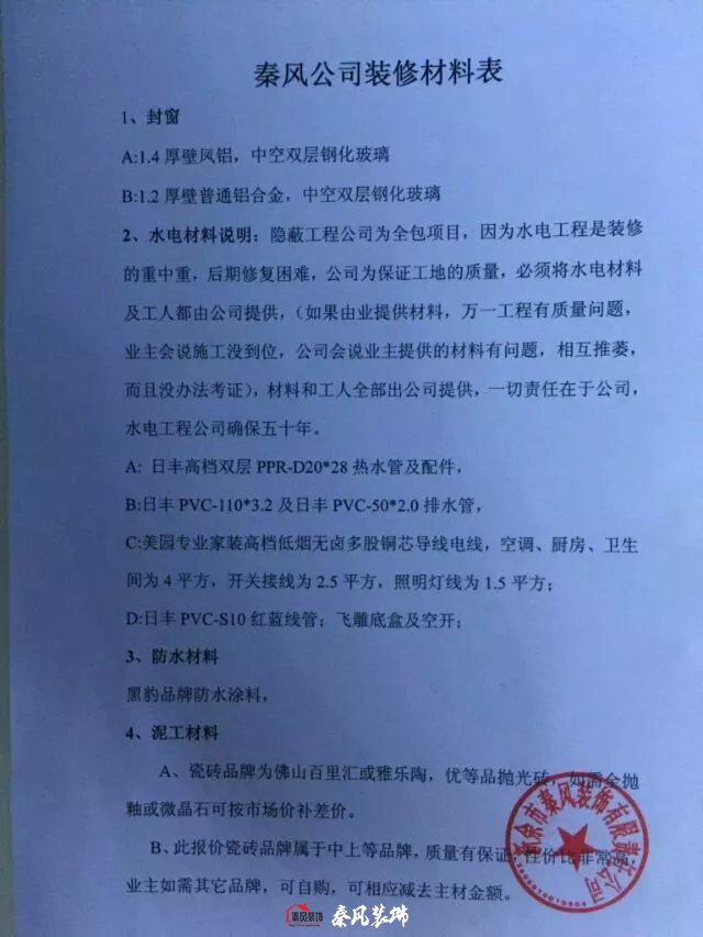 秦風(fēng)公司裝修材料配置,最近太多人問(wèn)了,于是決定發(fā)出來(lái),材料明朗,不搞虛假,只要我們用的材料不符,業(yè)主可以不付款,我公司可是“先裝修后付款,售后終身,隱蔽工程質(zhì)保50年”,我們沒(méi)有樣板房,每套房子都是樣板房,隨時(shí)參觀,隨時(shí)檢查。